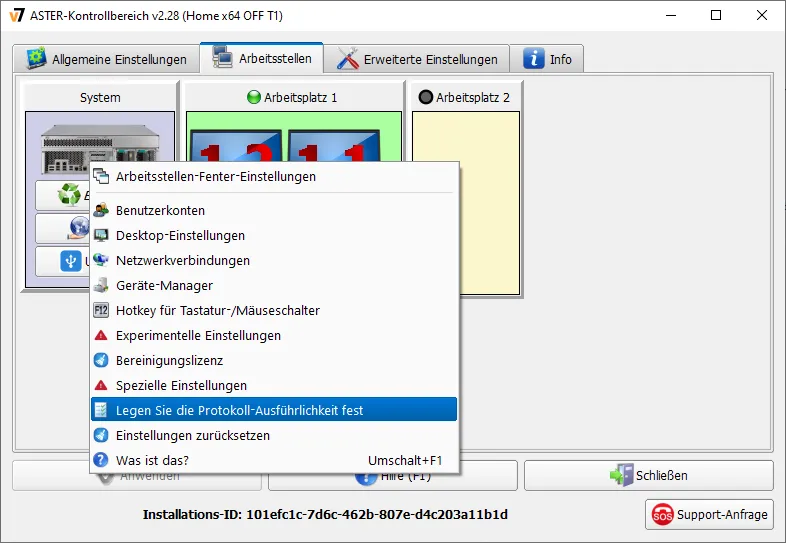 In diesem Menüpunkt können Sie den Detailgrad der Log-Dateien festlegen, die von der GUI ausgefüllt werden. Um einen Protokollfilter aufzustellen, wählen Sie auf der Registerkarte „Workplaces“ im Kontextmenü des Systemblocks den gleichnamigen Eintrag.