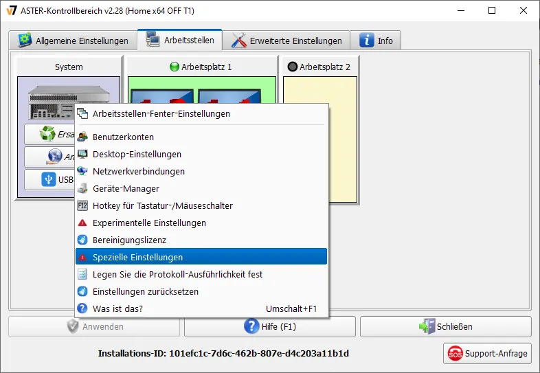 Um die „Spezialeinstellungen“ zu öffnen, wählen Sie im Kontextmenü des Systemblocks auf der Registerkarte „Arbeitsplätzen“ die gleichnamige Position.