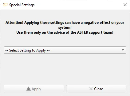 - “Спициальные настройки” - открывает окно для установки специальных настроек. Рекомендуется открывать и устанавливать данные настройки только по просьбе службы поддержки АСТЕР.
